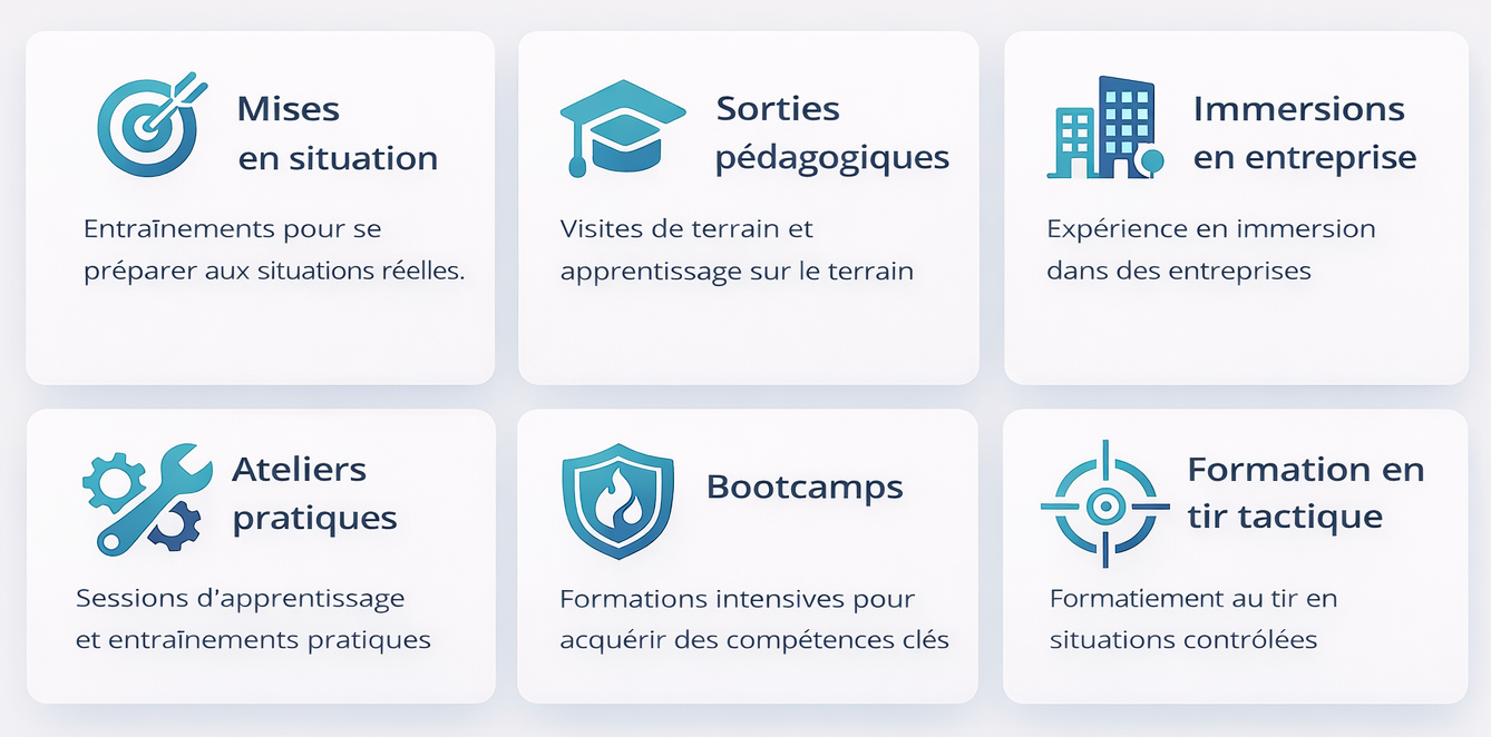 La Préparation Concours Métiers de la Sécurité propose une expérience immersive grâce à des activités variées : bootcamps, des cours et entraînements au tir tactique, des sorties et des ateliers pratiques.